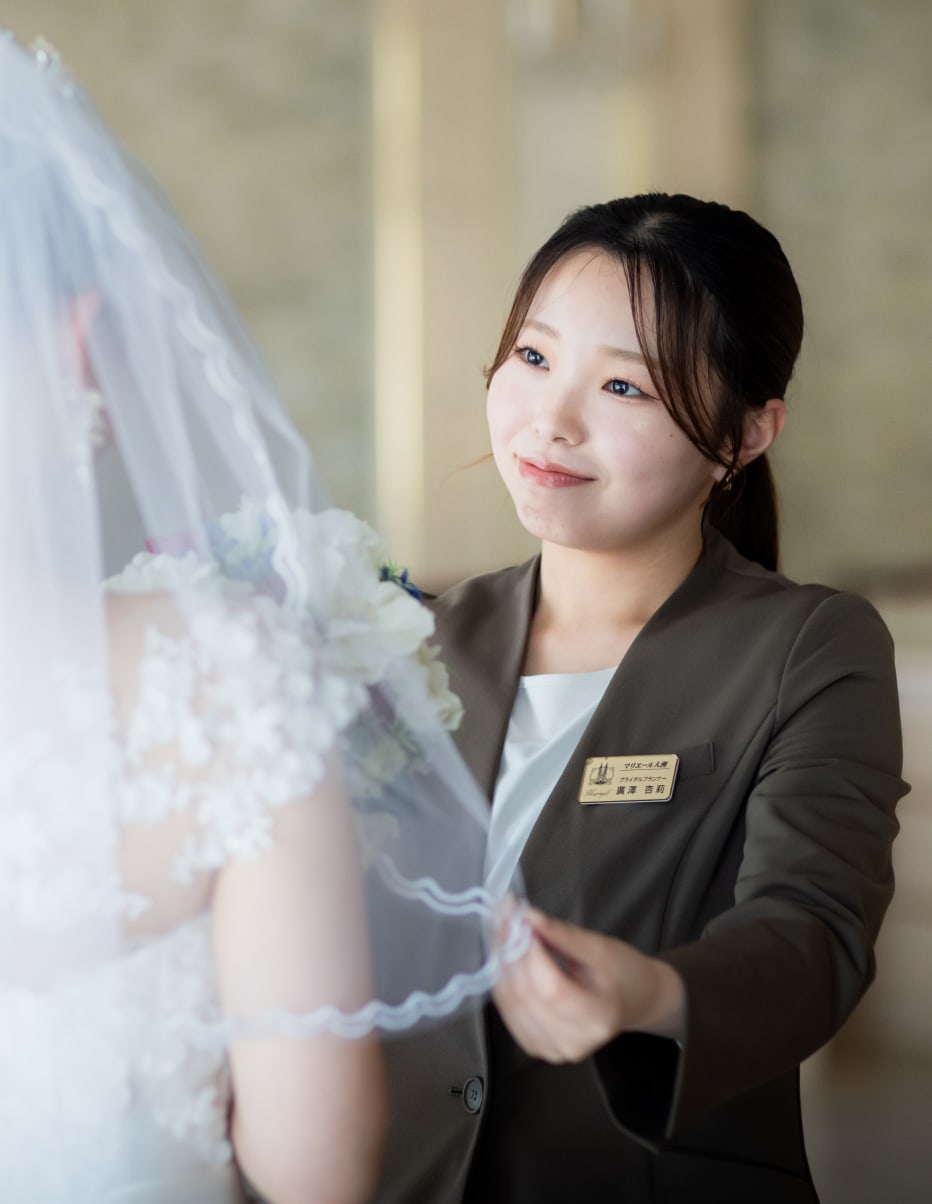 - 新郎新婦様と無事に当日を迎えることができ、結婚式を結んで「廣澤さんがプランナーさんで良かったです。ありがとうございました。」と言ってくださることが一番のやりがいです。他にも結婚式を結んだ後、マリエールでのイベントに参加して会いに来てくださる方もいて、やりがいを感じますし励みにもなります。絶対に失敗できない緊張感、様々な要望をお受けすることもありますが、幸せそうなおふたりを見た瞬間に味わえる達成感は、おふたりと一緒にハレの日を迎えたウェディングプランナーならではのやりがいです。