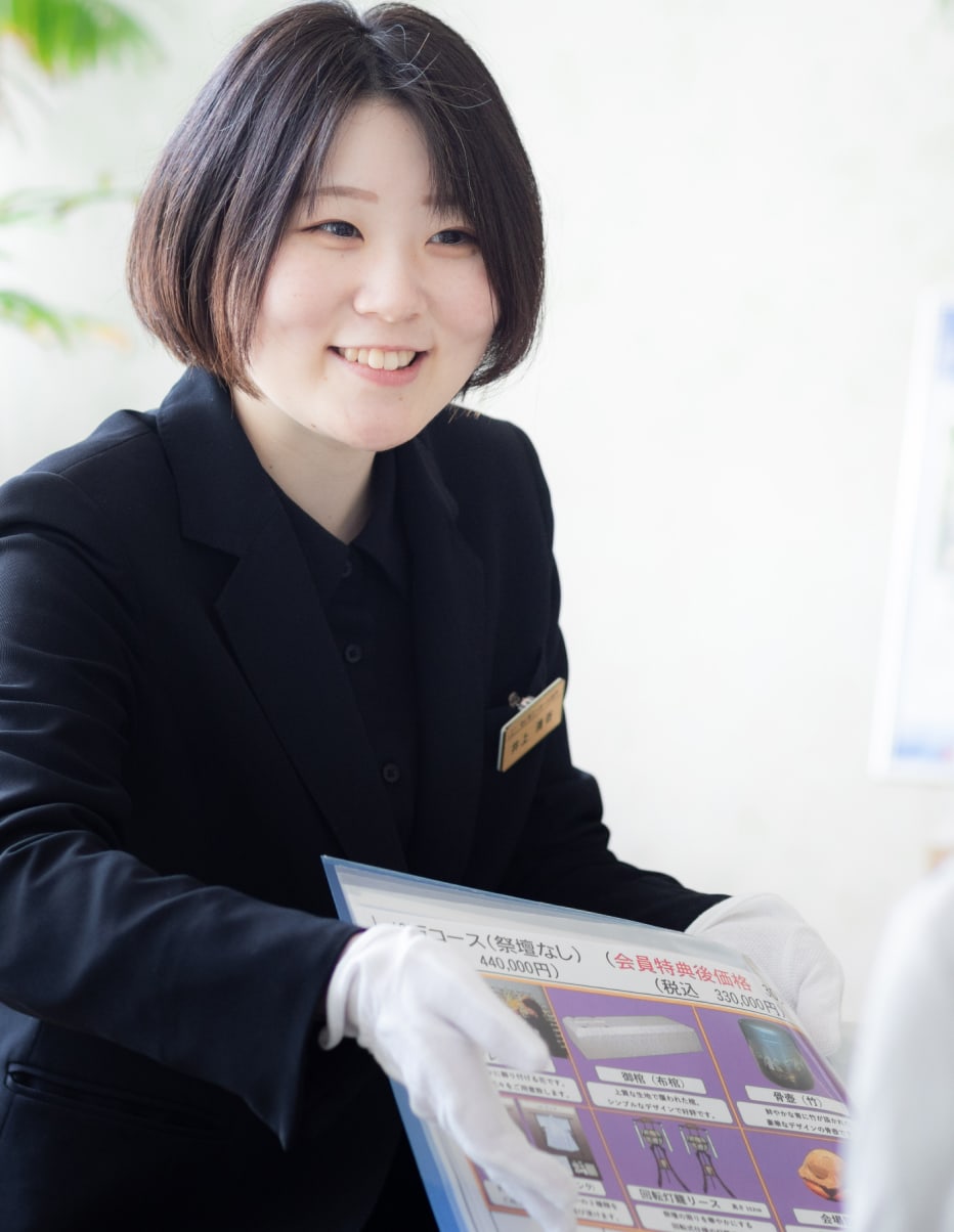 - 数年前に祖父を亡くし、悲しみにくれていましたが、葬儀の際にスタッフの方が優しい声をかけてくれたことで、悲しい中にも安らかな気持ちが生まれました。そんな思いから「遺族の方には葬儀で悔いの残らない時を過ごして欲しい」と思うようになり、この仕事を志望しました。