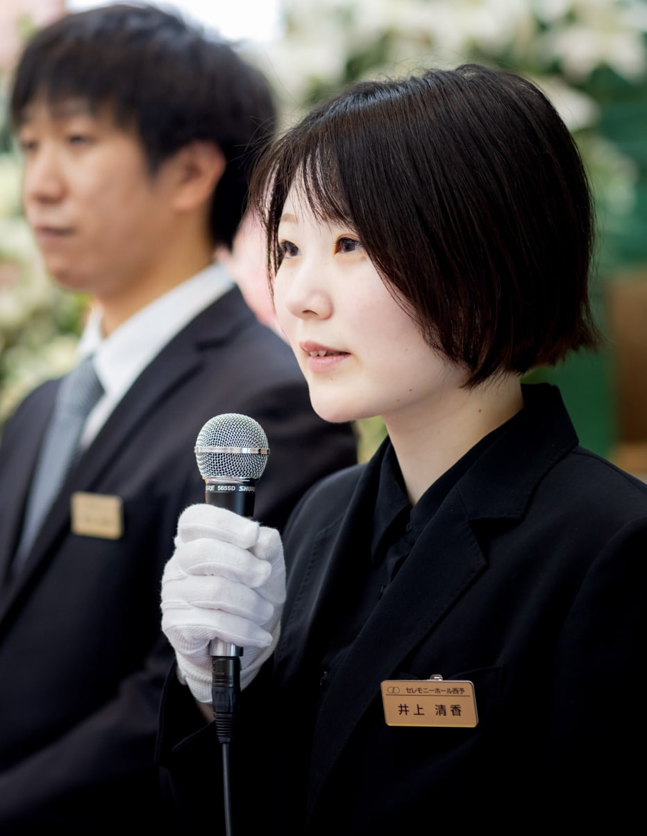 - 葬祭ディレクターとは、大切な人を亡くしたばかりのご遺族から故人に対する思いや、悼む気持ちを聴き取り、通夜・葬儀を円滑にサポートする仕事です。具体的には、お葬儀についての打ち合わせ、会場設営や告別式の立ち合い、お葬儀に必要な商品の手配を行っております。